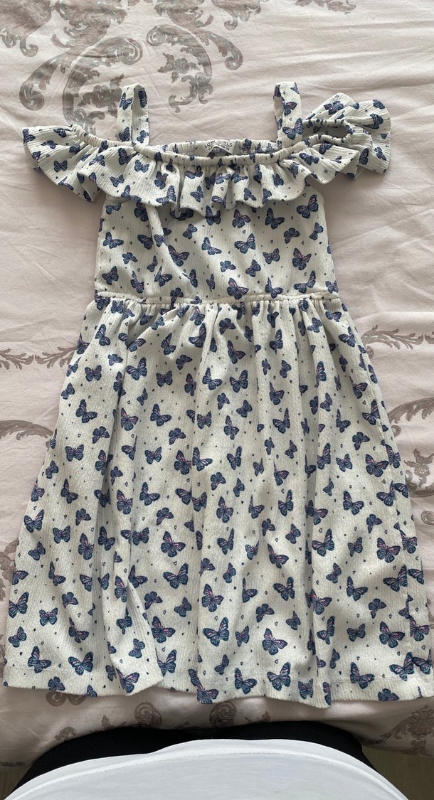 Rahat kesim, askılı ve fırfırlı straplez kız elbisesi. Yumuşak sentetik kumaştan, gri beyaz kelebek baskılı bohem tarzda.