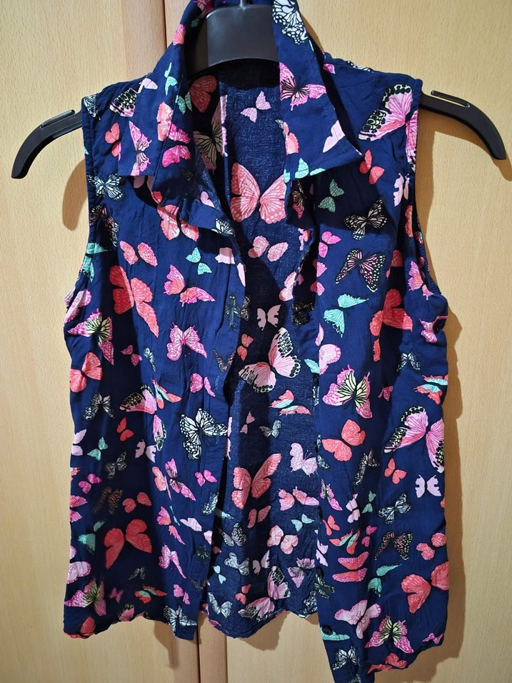 Kelebek desenli renkli kolsuz gömlek, düğmeli ve yakalıdır. Salaş kesimiyle günlük rahat sokak stiline uygundur.