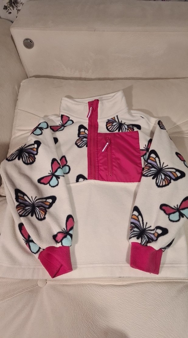 Kelebek desenli, uzun kollu, bol kesim kız polar sweatshirt. Fermuarlı göğüs cebine ve canlı pembe detaylara sahiptir.