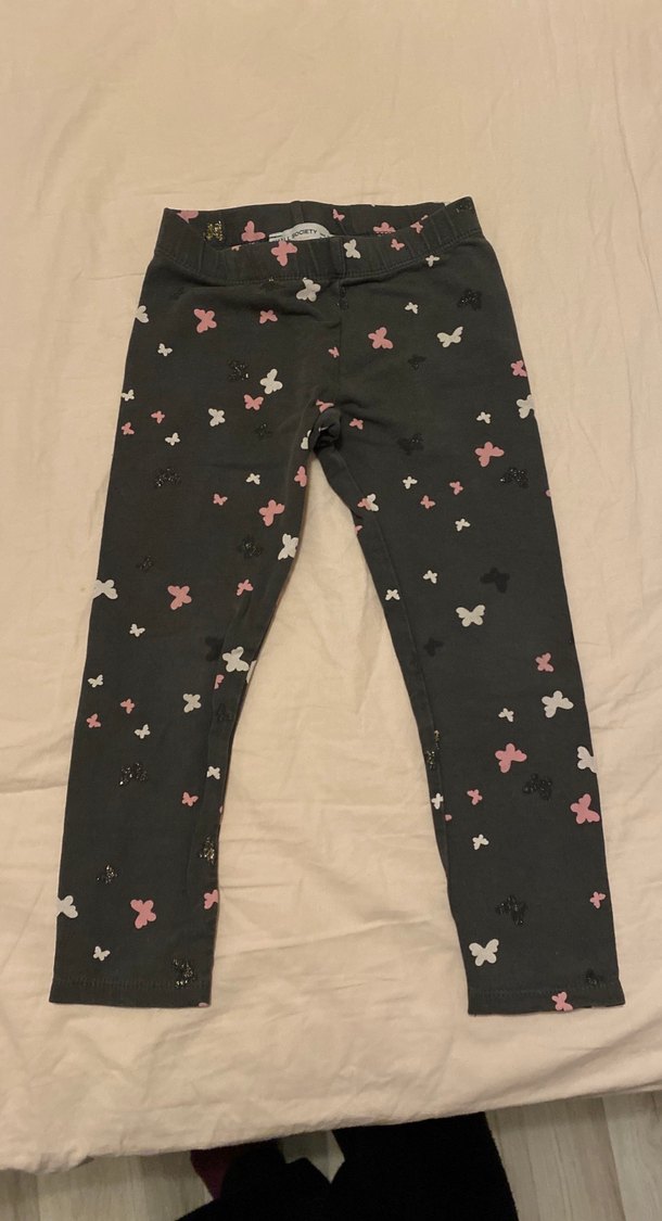 Sentetik kumaştan yapılmış, kelebek desenli ve tokalı bel detaylı, gri renkli, kız çocukları için dar kesim tayt.