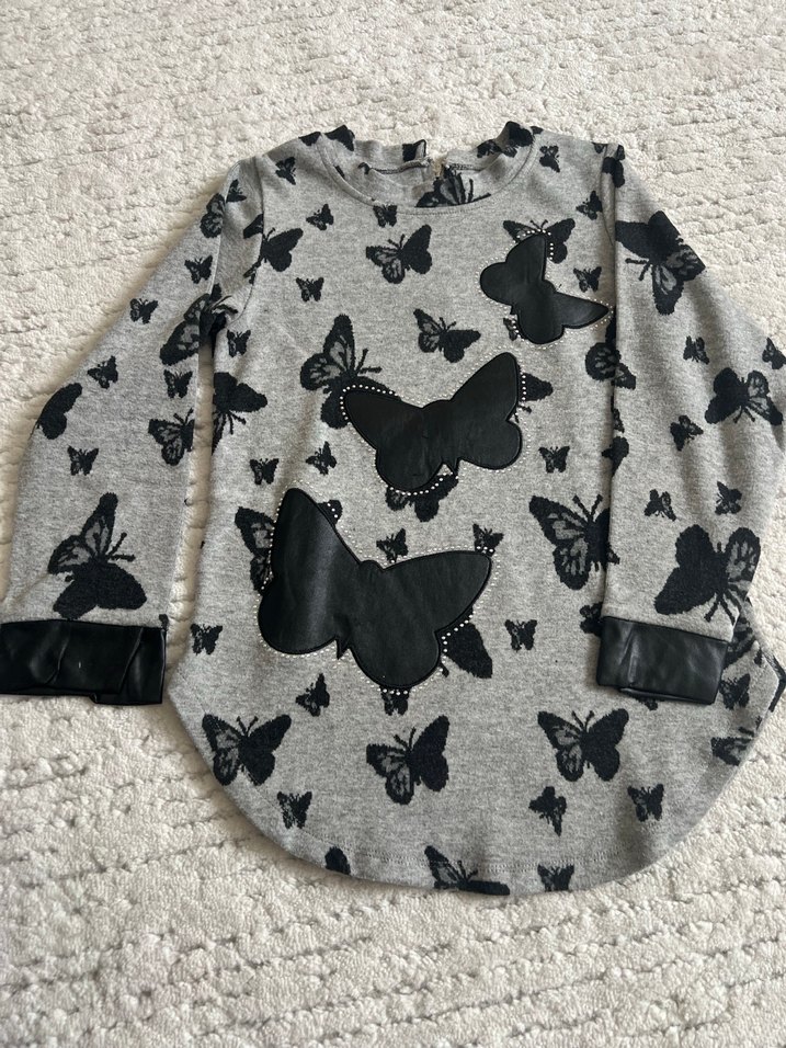 Gri renkli kız bluzu, uzun kollu ve yuvarlak yaka. Kelebek desenleri ve deri görünüm detayları vardır.bol kesim, gotik tarzda.
