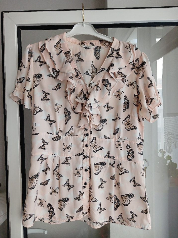 kelebek desenli kısa kollu gömlek. V yakalı, düğmeli gomlek Sifir ayarinda tril tril kumasi var yakasi firfirli kol ucu yarim lastikli iki koltuk alti arasi 50 cm kemerli kismi tek yon 43 cm koltuk altindan etek ucu 42cm etek ucu 3 pileli pudra rengine yakin bir rengi var olculere bakarak alim yapiniz iade yoktur marka temsili