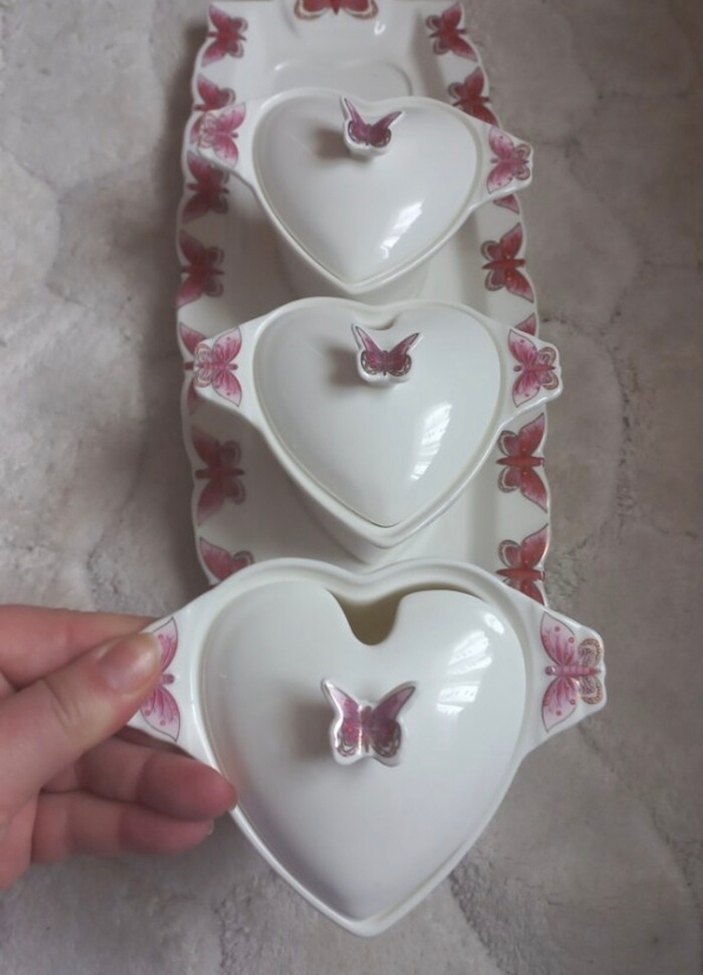 #Kelebek desenli, kelebek kulplu beyaz porselen kalp şeklinde kaplar ve uyumlu tepsi seti. #baharatlık #şekerlik herhangi bir deformasyon yoktur kullanılmadı #iadeyok marka temsili