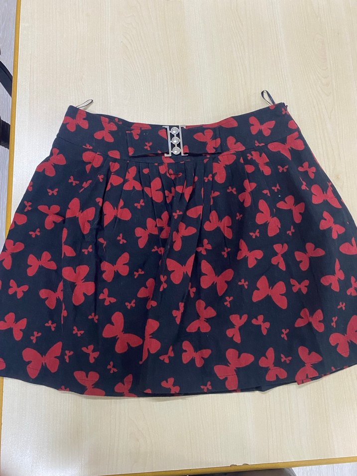 Koyu renkli pamuku kumaştan, kelebek desenli, kemerli ve bol kesim mini etek.
