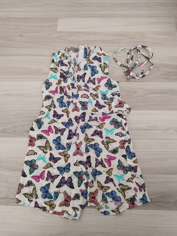 Kelebek desenli, kolsuz, mini tulum. Hafif sentetik kumaştan, bol kesim, halter yaka ve drapeli detaylara sahip. Bohem tarz için uygun.