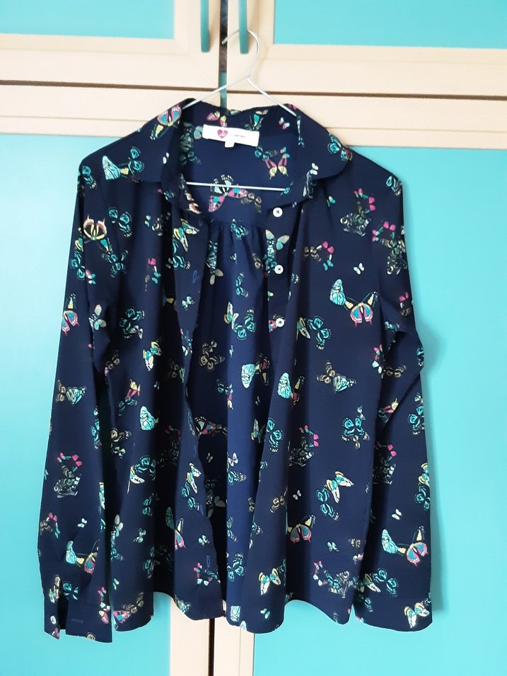 Koyu mavi renkli, kelebek desenli, yakalı ve düğmeli bohem tarzda kadın gömleği. Uzun kollu ve bol kesim, sentetik kumaş kullanılmış. m beden koton ,düğmeleri sağlam