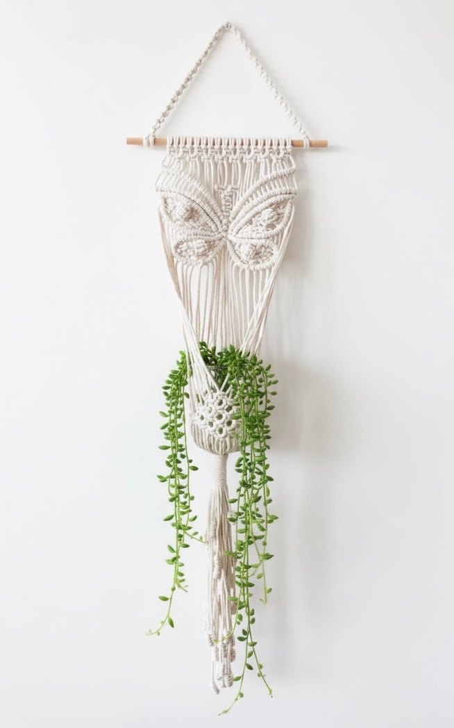Beyaz makrome duvar saksılığı, kelebek desenli ve ahşap çubuklu. Küçük saksıyı tutar, doğal bir hava katar.