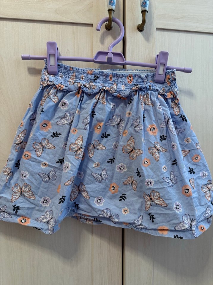 Kelebek ve çiçek desenli, pastel mavi renkli, pileli ve bol kesim kız çocuk eteği. Bohem, retro ve hippie tarzını yansıtır.