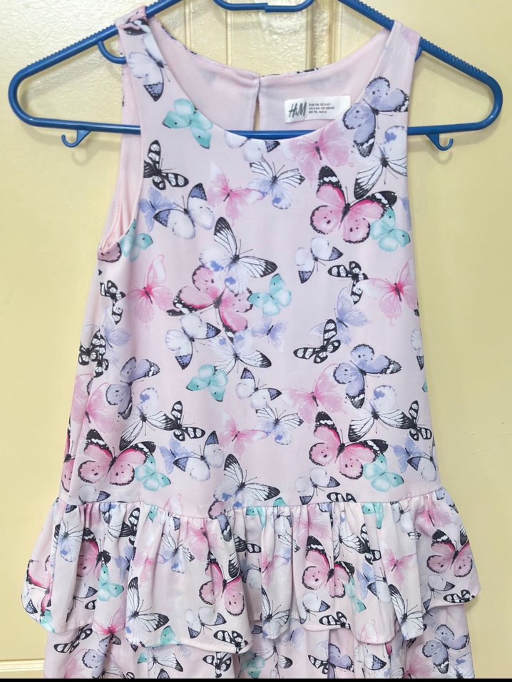 Kelebek desenli, pastel pembe renkli, kolsuz, salaş kesim kız elbisesi, yumuşak sentetik kumaştan ve fırfır detaylıdır.