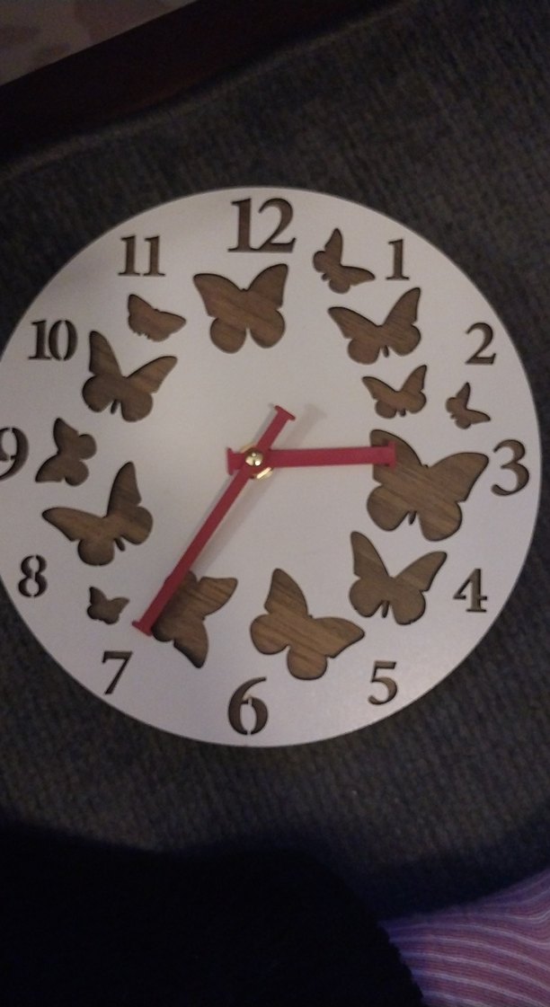 Kelebek desenli, renkli akrep ve yelkovanlı kahverengi zeminli duvar saati.