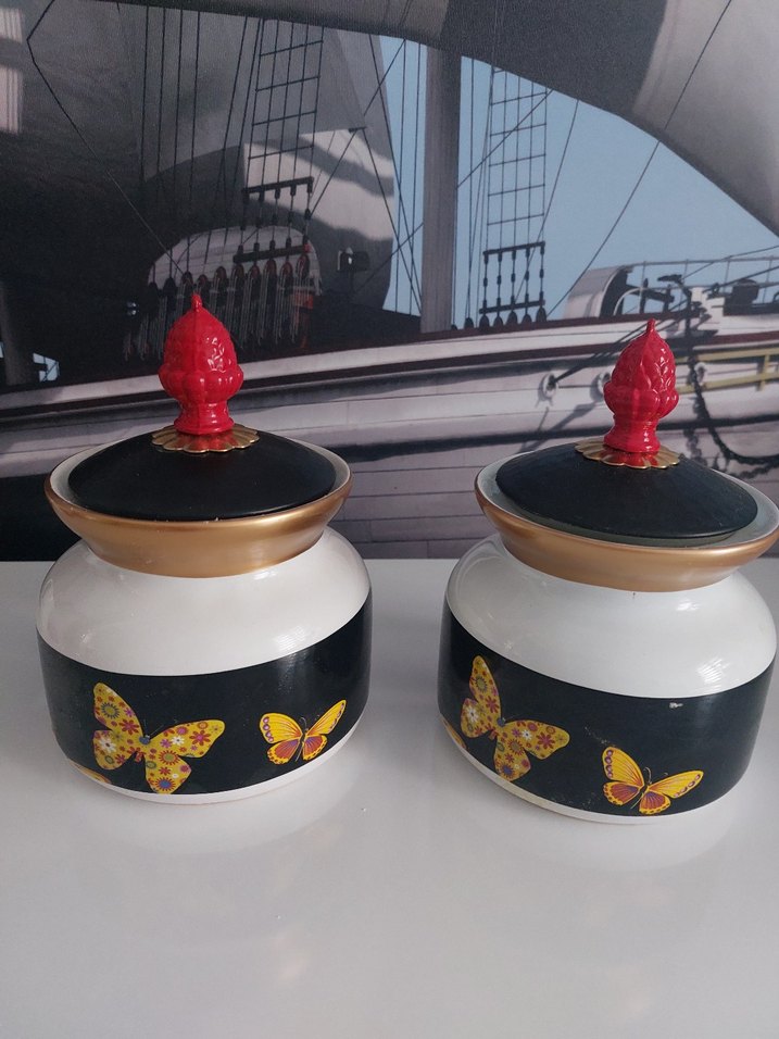 Kelebek desenli, renkli kapaklı iki adet şık saklama kabı.