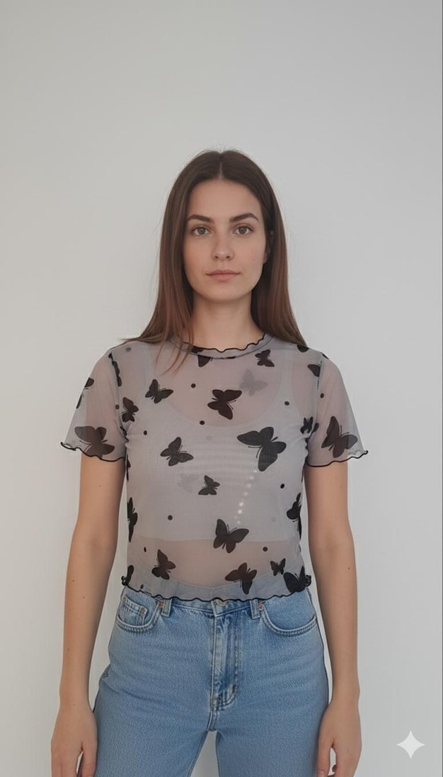 Kelebek Desenli Transparan Tül Bluz
