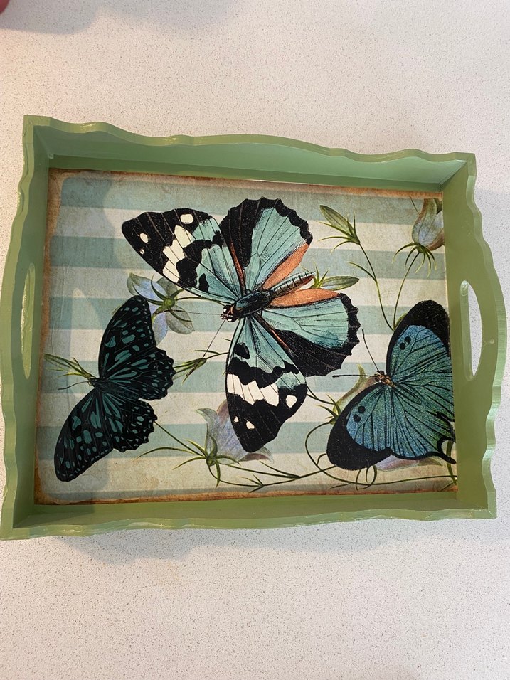 Çizgili arka planda koyu kelebek desenli, turkuaz çerçeveli tepsi, dekorasyona doğal bir dokunuş katıyor. 30*25 ölçüleri Kendim boyadım tasarladım