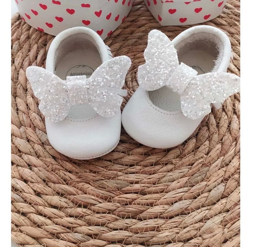 Opak Beyaz renkte ışıltılı kelebek detaylı hakiki deri yumuşacık ilk adım bebek patik ayakkabı 20 numara sıfır