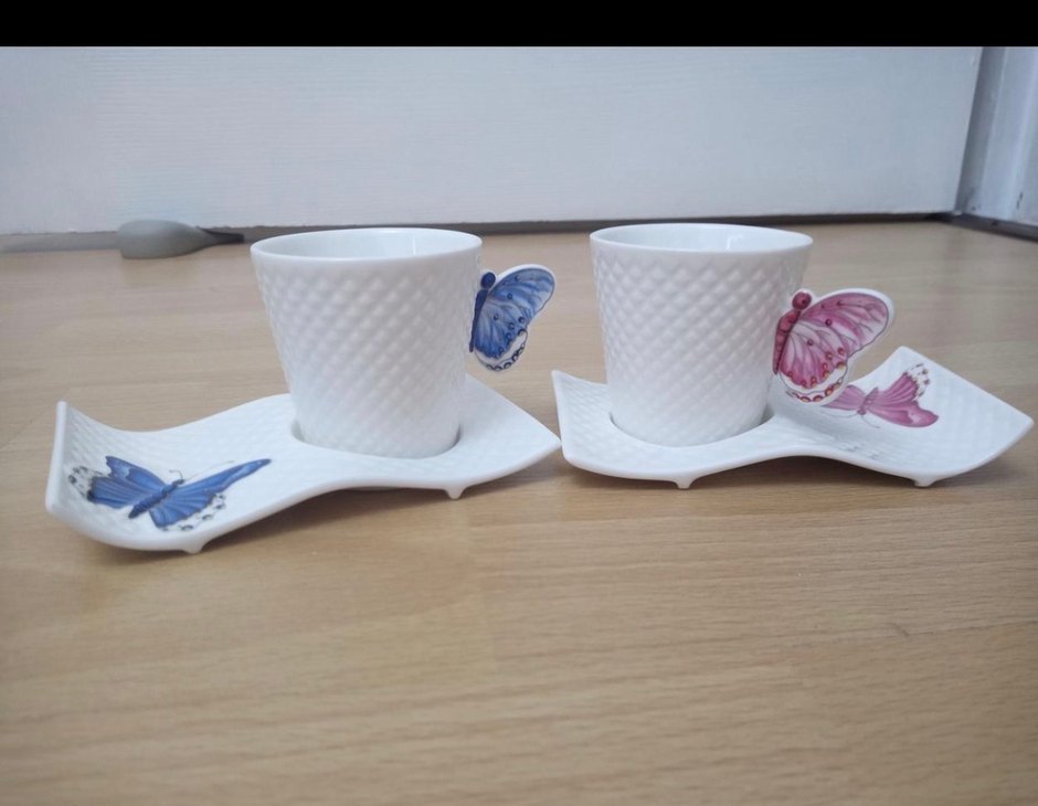 Kosova marka Mavi ve pembe kelebek kulplu, dokulu yüzeye sahip beyaz fincanlar ve uyumlu tabaklar.