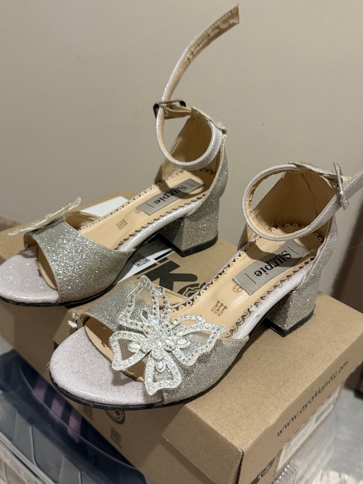 Kelebek desenli, tokalı beyaz kız çocuk topuklu ayakkabılar. Konvansiyonel tarzda, rahat kauçuk malzemeden yapılmıştır.