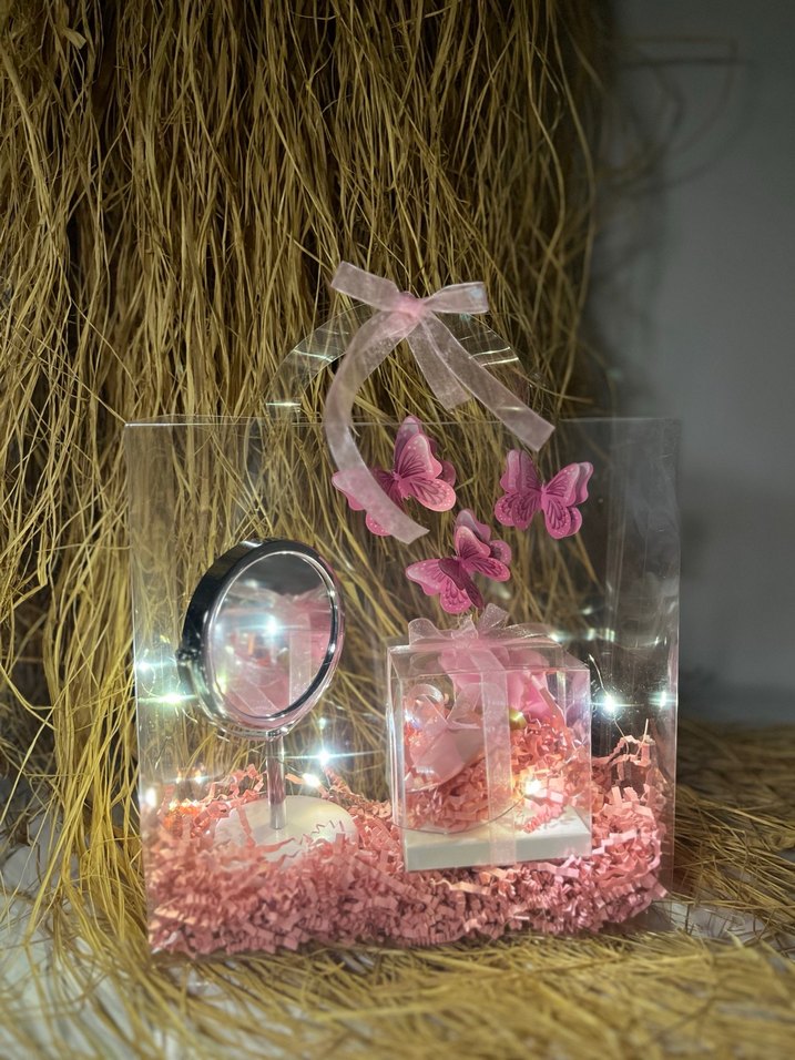 Kelebek detaylı, küçük aynalı ve pembe süslemeli şeffaf kutu hediye çanta