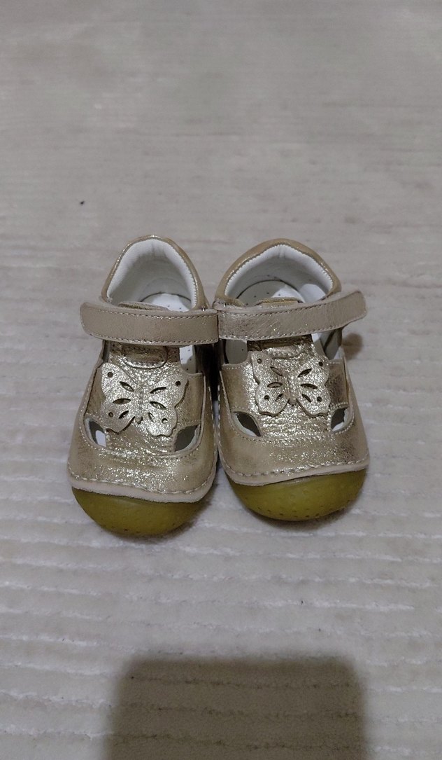 Bej renkli kız bebek ilk adım ayakkabısı, tokalı ve kelebek kesim detaylıdır. Kauçuk tabanlı, sade bohem tarzdadır.