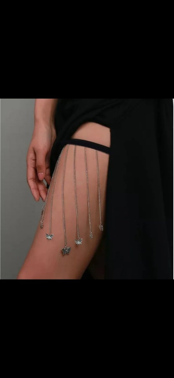 Kelebek figürlü detaylı siyah zincir body chain. Goth tarzı ve gösterişli parti stilleri için uygun, cesur bir aksesuar.