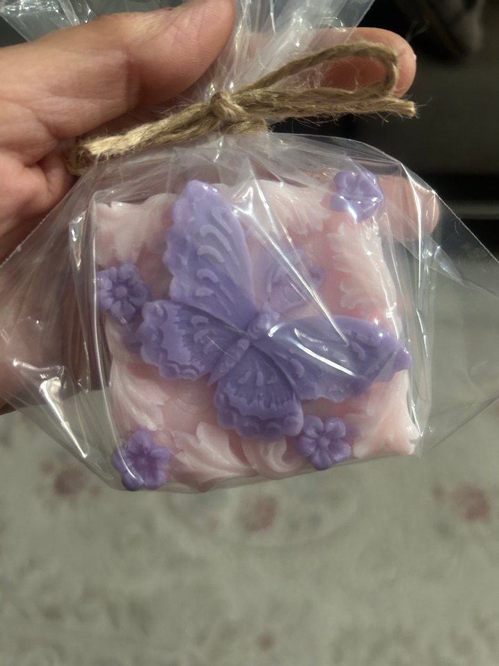 El yapımı sabun, pembe taban üzerinde mor kelebek ve çiçek desenleriyle süslenmiş, şeffaf ambalajda rustik ip bağlama ile sunuluyor.