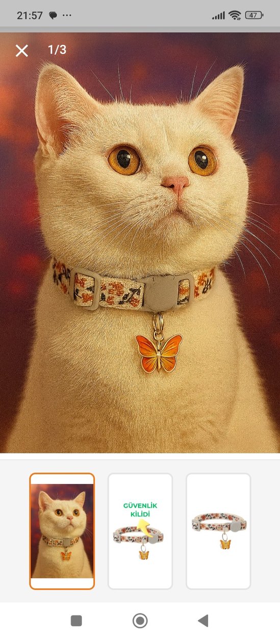 Kelebek figürlü ve güvenlik tokalı açık kahverengi kedi tasmasıdır.