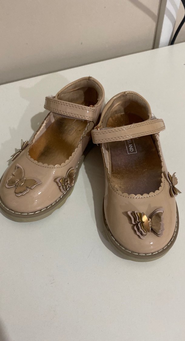 Bej renkli, kelebek işlemeli ve tokalı kız çocuk babetleri, kauçuk malzemeden, bohem tarzda.