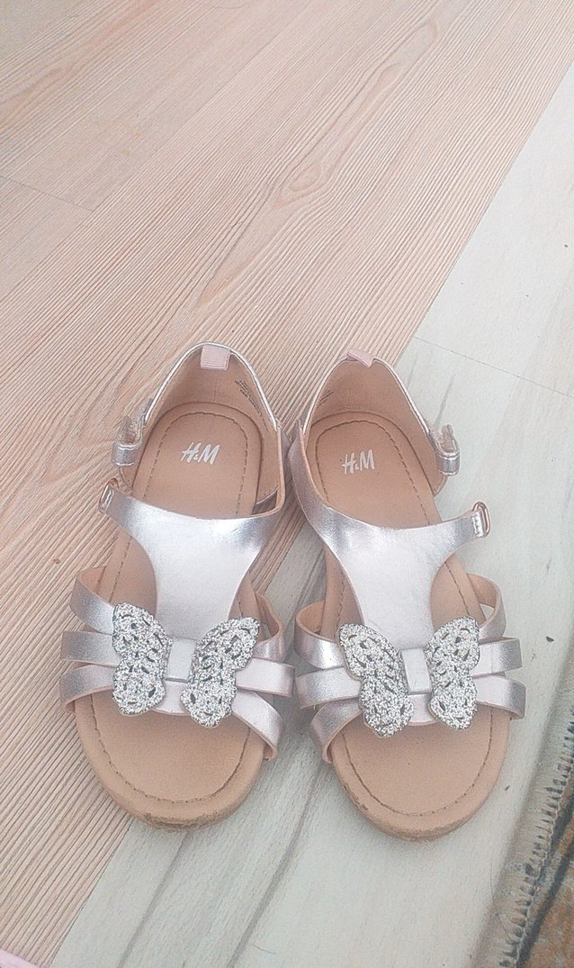 Açık bej renginde, kelebek işlemeli ve tokalı kız sandaletleri. Kauçuk malzemeden yapılmış, çağdaş tasarıma sahip. Marka: H&M.