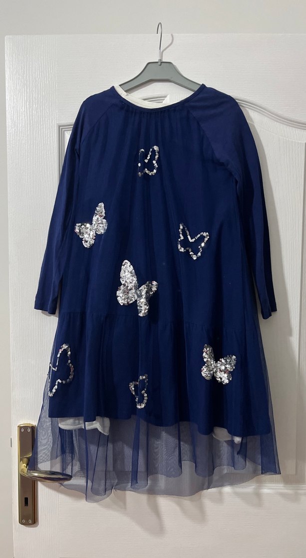Lacivert renkli, uzun kollu ve bol kesim kız elbisesi, kelebek işlemeleri ve volan detaylarıyla dikkat çeker. Yuvarlak yaka ve katmanlı etek ucu bulunur.