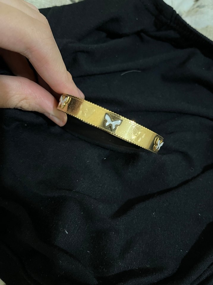 Parlak altın rengi bileklik, kelebek işlemeleri ve kemerli kapanışa sahiptir, vintage Paris sokak stilini yansıtır.