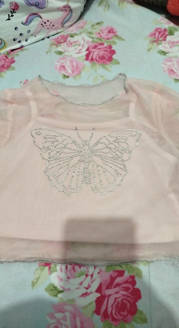 Kelebek işlemeli, pullu, pembe renkli, bisiklet yaka, kolsuz, vücuda oturan kız bolero. Yumuşak sentetik kumaştan, bohem tarzda.