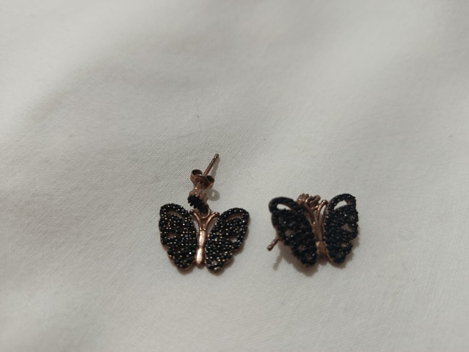 Kelebek İşlemeli siyah taşlı 925 ayar gümüş rose renk Küpeler. çok hafif kararma var ama zarar edecek boyutta değil parlatılabilir.