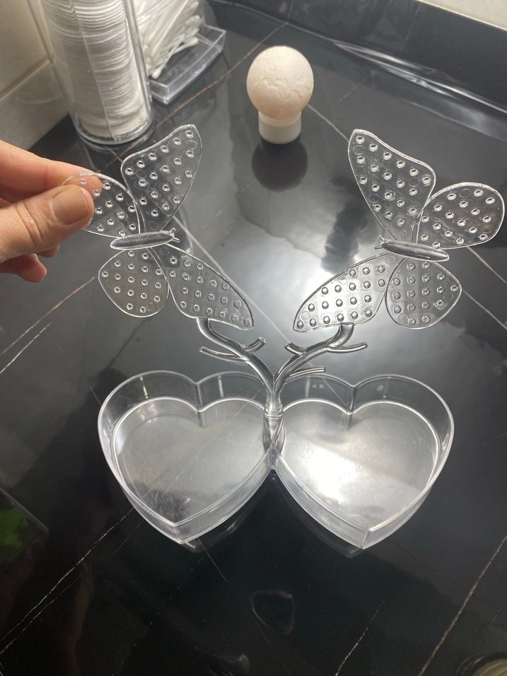 İki kalp şeklinde bölmeli, kelebek kapaklı plastik takı standı. Kapaklar noktalı dokulu ve menteşelidir. Küçük eşyalar için uygundur. Takı standı