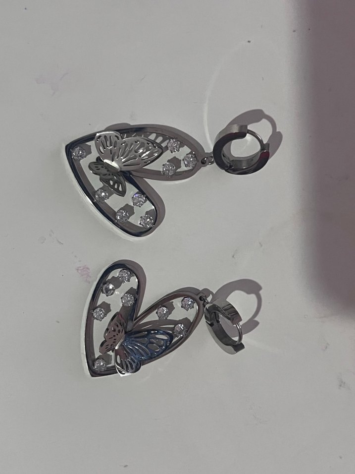 Kelebek desenli, tokalı kısa gri küpeler. Gotik ve bohem tarzı bir arada sunar. Günlük kullanıma uygundur.
