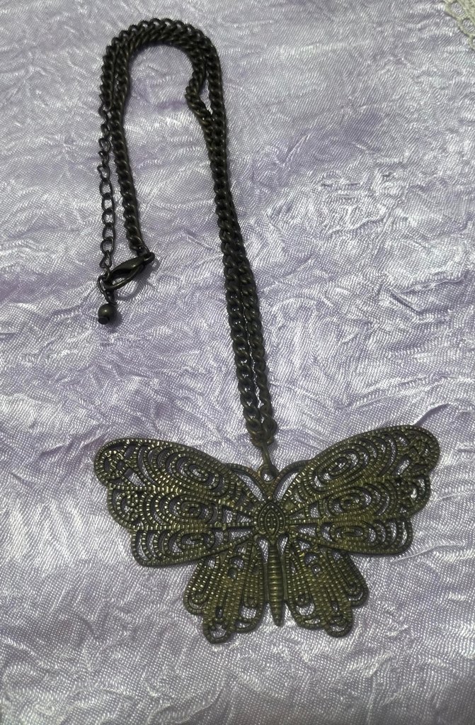 Uzun kahverengi zincir kolye, vintage nakış desenli detaylı kelebek motifi ile günlük kullanıma uygun goth ve bohem tarzda.