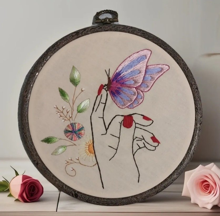 Kırmızı tırnaklı el ve mor kelebek işlemeleri ile çiçek detaylı bohem tarzı duvar süsü.