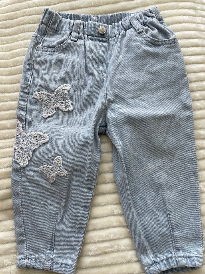 Mavi kot kumaştan, kelebek nakışı ve dantel detaylı, bol kesim kız çocuk pantolonu, trend sokak stiline uygun.