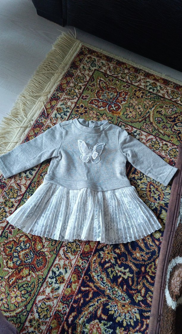 Gri renkte, kelebek nakışlı, uzun kollu, bol kesim ve bisiklet yaka kız elbisesi. Etek kısmı fırfırlı ve bohem tarzda.