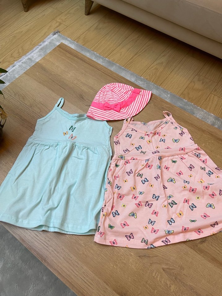 Kelebek nakışlı, pile detaylı, askılı ve bol kesim kız elbisesi, rahat sokak stili için uygundur. 12/18 I ince tiril tiril pamuklu silk blue marka hiç kullanılmamış sadece etiketi çıkarılmış iki elbise ve aynı zamanda çok tatliş bir şapka arkada esneme payı var 2 yaşa kadar falan olur diye düşünüyorum…