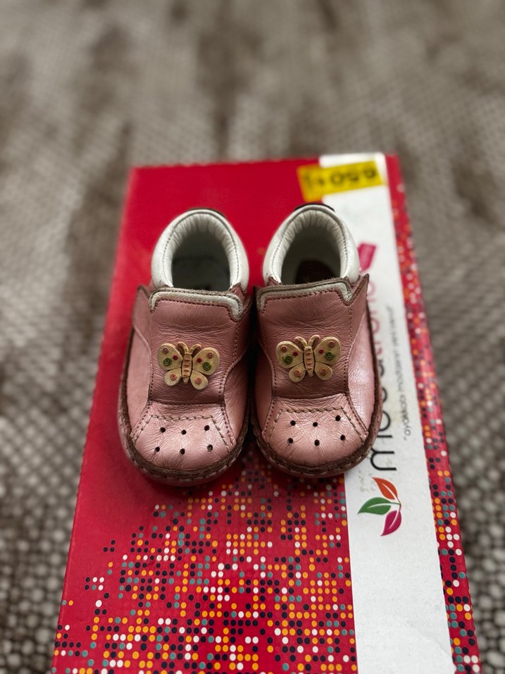 Pembe kauçuk kız bebek ilk adım ayakkabısı, cırt cırtlı ve renkli kelebek nakışlıdır. Rahat ve kolay kullanımlıdır. Sol ayaktaki keçe yırtıldığı için yoktur
