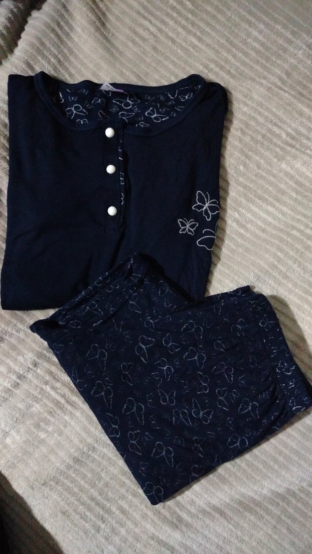 Kelebek nakışlı, koyu mavi renkli, kuzun kollu ve normal boy, bol kesim kadın pijama takımı. Goth tarzını yansıtan rahat bir modeldir.