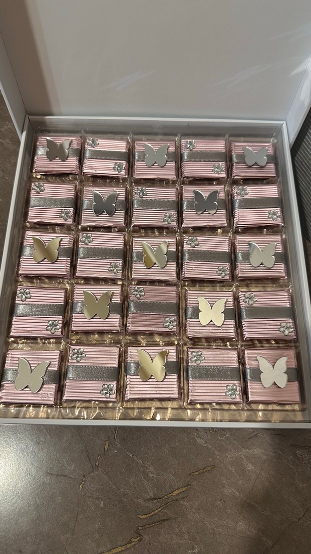 Gümüş ve altın kelebek süslemeli pembe çikolatalar, istenen desen ve adet yapılır fiyat için bilgi isteyin