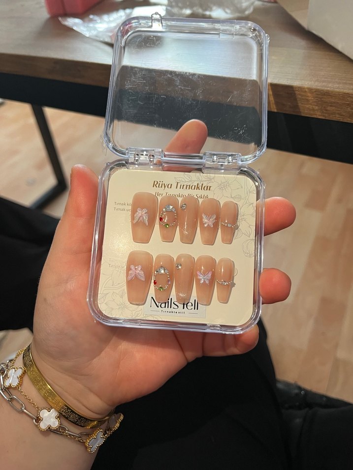 Zarif nude tonları, kelebek figürleri ve taş detaylarıyla hazırlanmış bu takma tırnak seti; normal ışıkta sade ve şık, flaşlı çekimlerde ise ışıl ışıl parlayan bir görünüme sahiptir. Özel tasarımı sayesinde hem günlük kullanımda hem de davet, nişan, söz ve özel günlerde rahatlıkla tercih edilebilir. Fotoğraf ve videolarda çok estetik durur. Öne Çıkan Özellikler • Nude – doğal renk tonları • Kelebek ve taş süslemeler • Flaşta ekstra parlak görünüm • Uzun ve zarif form • Hafif ve konforlu kullanım • Tekrar kullanılabilir Paket İçeriği • 10 adet takma tırnak (2 el set) • Takma tırnak yapıştırıcı bantlar • Tırnak törpüsü • Tırnak itici (manikür çubuğu) • Temizleme pedi Evde kolay uygulama için uygundur, profesyonel işlem gerektirmez.