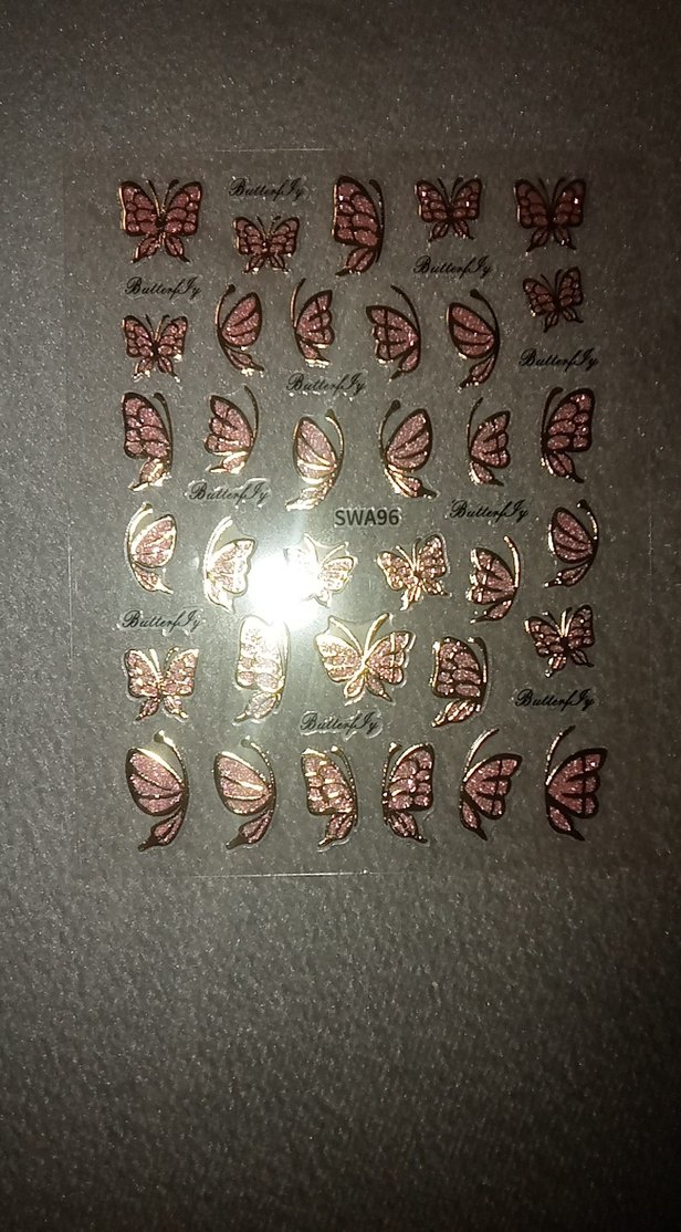 Açık kahverengi kelebek figürlü tırnak süslemeleri, farklı kanat desenleri ve 'Butterfly' yazısı bulunan şeffaf yaprak üzerinde.