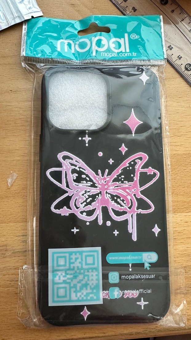 Koyu renkli telefon kılıfı, pembe gotik kelebek ve fiyonk detayına sahip. Kılıf, dekoratif ışıltılarla gotik tarzı yumuşak pembe renkle buluşturuyor.