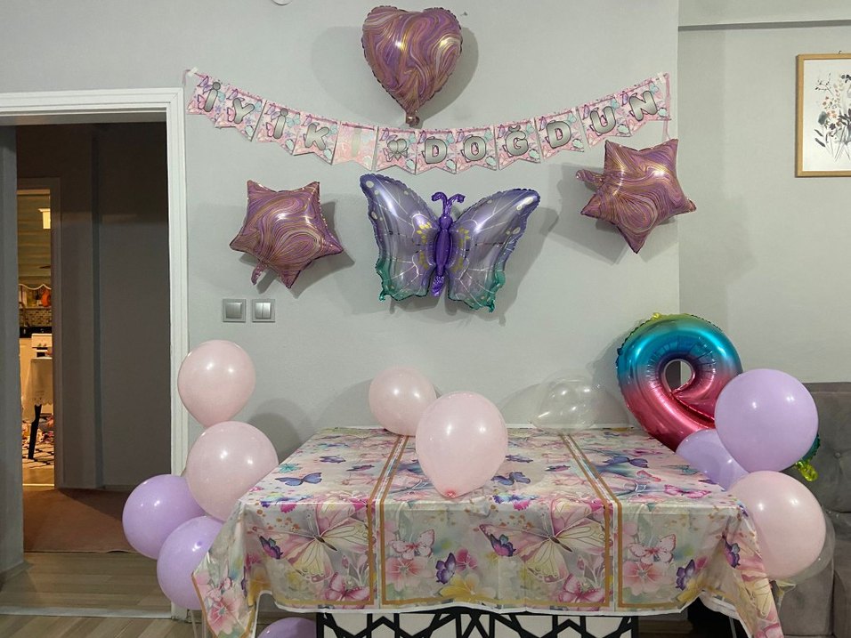 Kelebek desenli masa örtüsü ve İyiki doğdun yazılı banner.