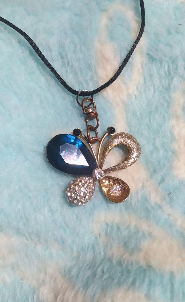 Kelebek desenlidir. Siyah takma ipini ilana koyarken yeniledim, uzundur.