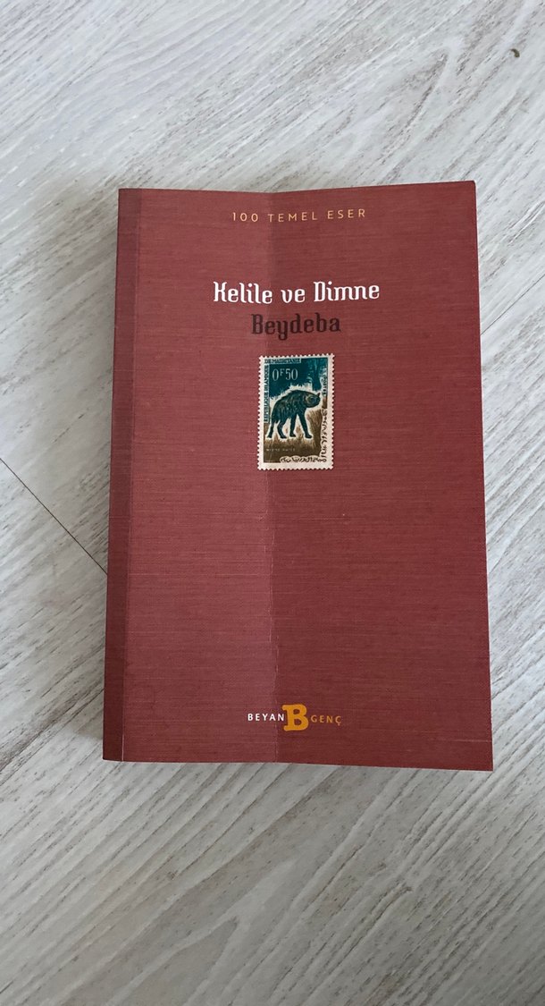 Beydeba'nın "Kelile ve Dimne" adlı şiir kitabı, 100 Temel Eser serisinden. Kahverengi kapak ve nostaljik pul görseli içerir. Islanmış son sayfaları