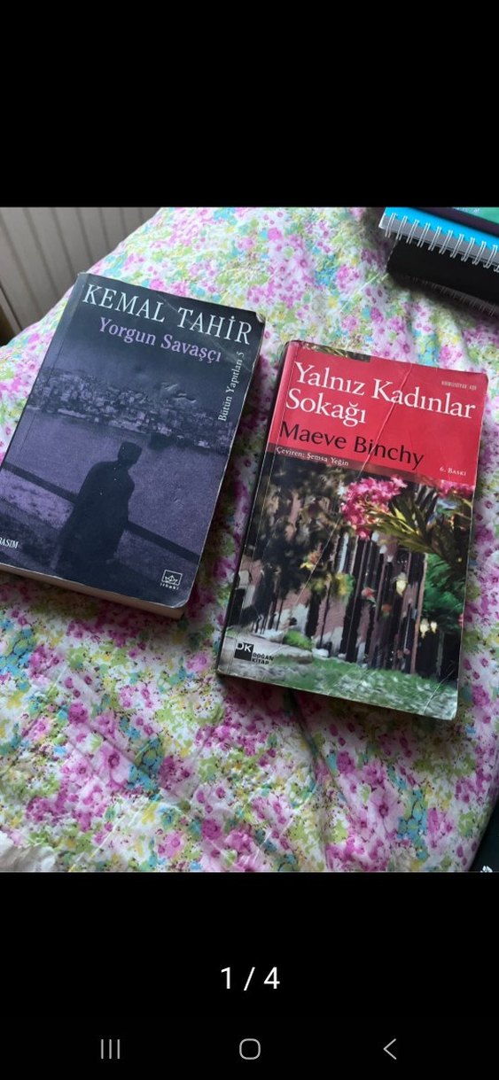 Kemal Tahir'in "Yorgun Savaşçı" ve Maeve Binchy'nin "Yalnız Kadınlar Sokağı" romanları çiçekli bir yüzey üzerinde yer alıyor.