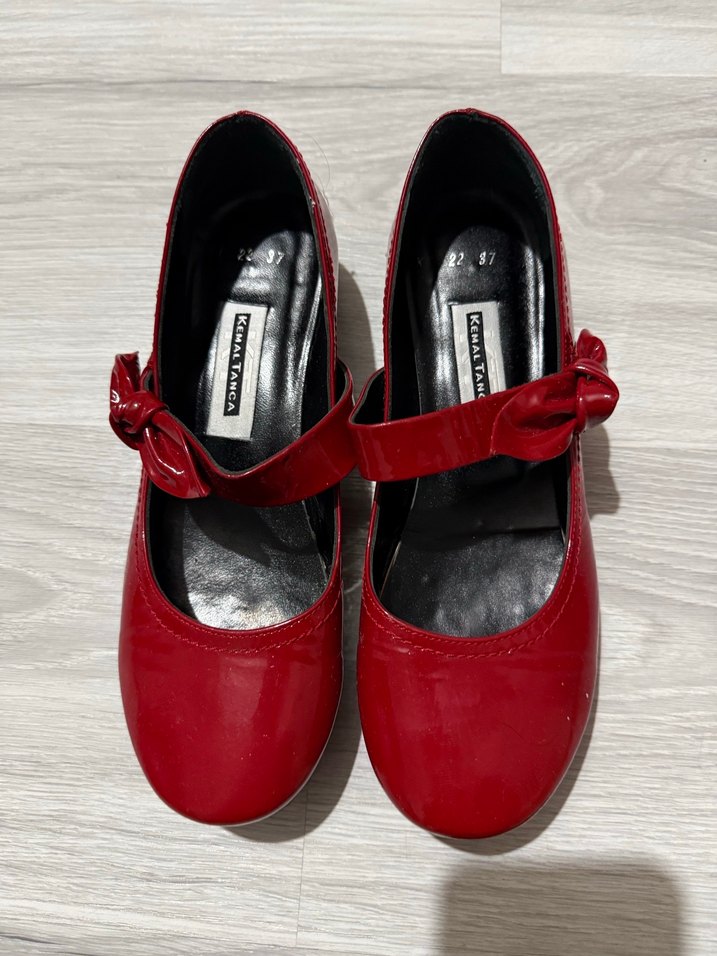 Kemal Tanca kırmızı, tokalı bantlı, desensiz ve koyu kırmızı renkte babet ayakkabı. Esnek kauçuk malzemeden, sokak stiline uygun. Soyulmaları mevcut