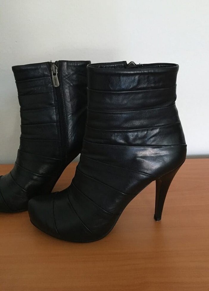 Siyah deri, stiletto topuklu kadın botları, tokalı detaylara sahip ve cesur goth tarzında, romantik akşamlar için uygun. Sadece 1 defa kullanıldı 38 numaradır